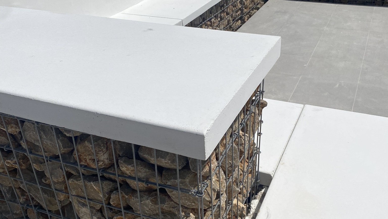 El principal reto era crear un elemento de coronación robusto y con un diseño pulcro para un gavión. El cliente requería un material que ofreciera un acabado liso, un color claro que contrastara con la piedra del gavión, y una durabilidad excepcional dada la proximidad a la costa y la exposición directa a los elementos.